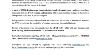Jammu & Kashmir News नेशनल टेस्टिंग एजेंसी ने जम्मू-कश्मीर में सीयूईटी-यूजी परीक्षाओं को फिर से शेड्यूल किया