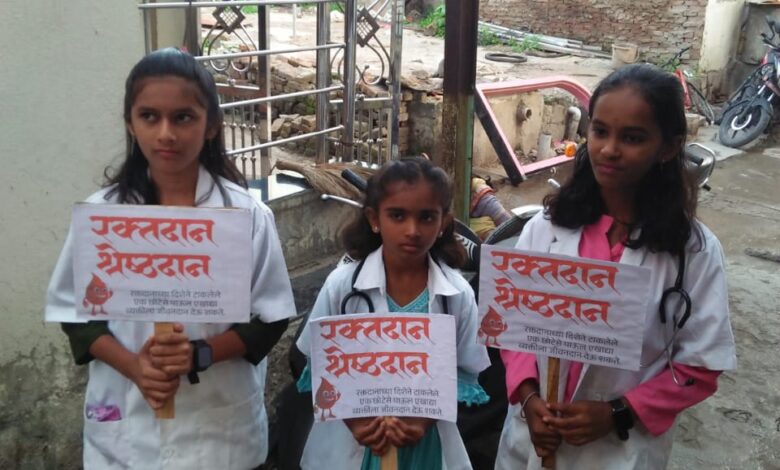 बुलढाणा जिल्ह्यातील चिखली मध्ये गणपती बाप्पा यांच्या अनंत चतुर्दशीच्या दिवशी रक्तदान श्रेष्ठ दान असा उपक्रम चिखली तालुक्यात डॉक्टर च्या वेशभुषा मध्ये विद्यार्थ्यांनी दिसत होत्या हाता मध्ये बोर्ड घेऊन लोकांना जागुत करण्याचे काम सुरू होते रक्तदानामुळे प्रत्येक वर्षी अनेक काना जीवदान मिळते मोठ्या सर्जरी मध्ये शिवा गंभीर परिस्थिती रक्तदानामुळे पेशंट चे प्राण वाचण्यास मदत होते औ तसेच गरोदरपणात बाळाचे आणि आईचे प्राण वाचण्यास रक्तदान महत्त्वाचे ठरते भारत देशात 120 कोटी लोकसंख्या असूनही केवळ 74 लाख कोटी वीस लाख लिटर रक्त संघटित होते एखाद्या व्यक्तीला रक्ताची आवश्यकता का असते याची विविध कारण आहे हे