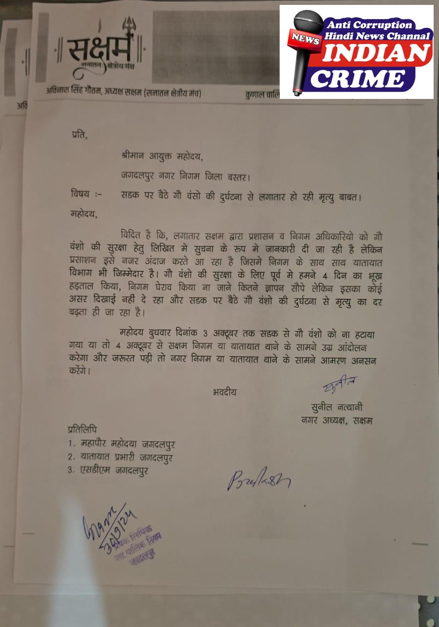 Chhattisgarh News सडक पर बैठे गौ वंसो की दुर्घटना से लगातार हो रही मृत्यु पर सक्षम ने निगम को सौपा ज्ञापन, जवाब मे जगदलपुर निगम आयुक्त ने लम्पी वायरस का हवाला दिया