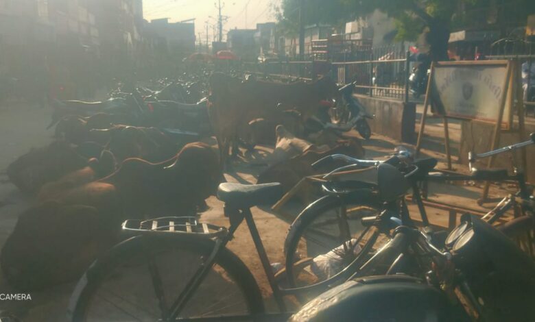 અમરેલી ના રાજકમલ ચોક પાસે આવેલ વેજીટેબલ માર્કેટ જ્યાં દરરોજ હજારો માણસો અવરજવર કરે છે અમરેલી શહેર ની મેઈન બજાર માટે નો મેઈન રસ્તો પણ અહીં થી જ પસાર થાય છે ત્યારે રસ્તા ઉપર પશુઓ ના લીધે અવાર નવાર ટ્રાફિક જામ થાય છે અત્રે ઉલ્લેખનીય છે દિવાળી નજીક છે તયારે લોકો પોતાના પરિવાર સાથે ખરીદી માટે નીકળતા હોય અકસ્માત નો પણ ભય રહે છે
