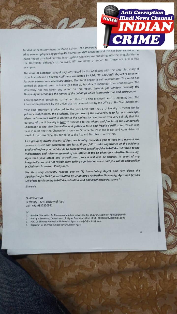 (अनुलग्नक 03 देखें) -उपरोक्त जानकारी देकर महामहिम से अनुरोध है कि विश्वविद्यालय उच्च एनएएसी ग्रेडिंग/रेटिंग हासिल करने के लिए भ्रामक और तुच्छ जानकारी (fake and frivolous information ) प्रस्तुत कर रहा है। विश्वविद्यालय के प्रति भावनात्मक लगाव और उसके स्तर में अनवरत तरक्की की कामना रखने वाले नागरिक और पूर्व छात्रों के रूप में हम यह समझने में विफल हैं कि तथ्यात्मक गलत जानकारियां देकर अगर उच्च एनएएसी रेटिंग / ग्रेडिंग ( NAAC Rating / Grading ) विश्वविद्यालय को मिल भी जाती है तो वह उसके प्रशासन में कैसे बदलाव लाएगी और हितधारकों को इससे कैसे लाभ होगा। -=ग्रेडिंग अपग्रेड करने को विश्वविद्यालय तंत्र जो तौर तरीके अपना रहा है,वह सरकारी धन और व्यवस्था के दुरुपयोग से अधिक कुछ भी नहीं है। इस प्रकार की ग्रेडिंग से विश्वविद्यालय और छात्रों को कोई भला नहीं होने वाला। राज्य सरकार ही नहीं डीम्ड और निजि प्रबंधन के विश्वविद्यालय तक शासन के द्वारा प्रभावी किये गये एक्ट के तहत संचालित किये जाते हैं ,लेकिन लगता है कि डा भीम राव अम्बेडकर वि वि आगरा को इन कानूनों और संबंधित एक्ट की कोई परवाह ही नहीं है। विवि प्रशासन से जुड़े अधिकारी अपनी मनमर्जी से जो चाहते हैं कर डालते हैं। जो चल रहा है, उससे नहीं लगता कि एनएएसी ग्रेडिंग/रेटिंग से विश्वविद्यालय प्रशासन में सुधार होगा। जनसामान्य तक का मत है कि विश्वविद्यालय अधिनियमों और संविधियों द्वारा चलाया जाता है न कि विश्वविद्यालय के अधिकारियों की व्यक्तिगत धारणाओं और कल्पनाओं द्वारा। कष्टकारी है कि शिक्षाविदों की बहुतायत वाले आगरा महानगर के सबसे पुराने वि वि में घोड़े के आगे गाड़ी जोतने ( putting a cart before the horse) जैसा कारनामा अंजाम दिए जाने की कोशिश बेखौफ की जा रही है। –विश्व विद्यालय में कितनी अनियमित्ताये है और मनमानी का दौर किस प्रकार चल रहा है, इस पर बहुत कुछ कहा जा सकता है और पूर्व में कहा भी जा चुका है। उपरोक्त अनियमितताओं को दोहराने के स्थान पर इनसे संबंधित अनुलग्नक प्रस्तुत कर रहे हैं। उपरोक्त में से हर साक्ष्य अपने आप में हमारी चिंता का औचित्य बताने को पर्याप्त है।