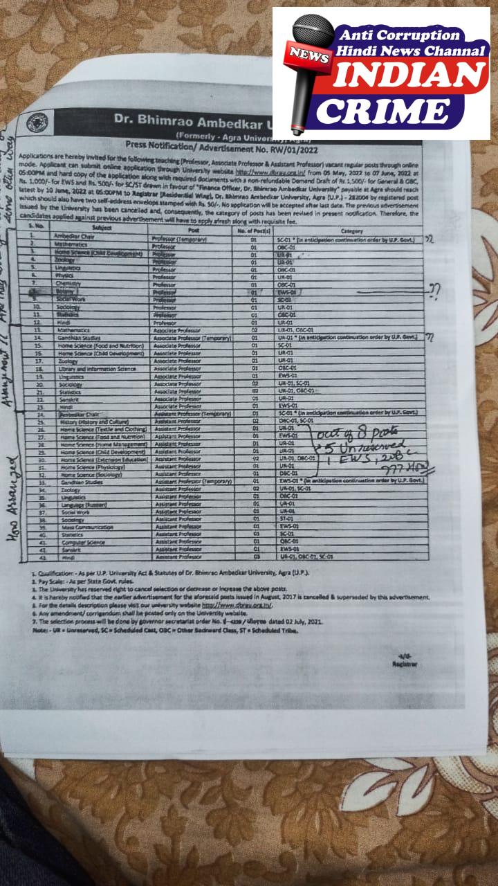 संकायों की प्रकाशित सूची की सावधानीपूर्वक जांच से पता चलेगा कि उल्लिखित कई सहायक प्रोफेसर विश्वविद्यालय में सेवारत रहे या सेवारत महानुभावों के निकट संबधी या उनके रिश्तेदारों आश्रित हैं। जो स्पष्टत:शिक्षा में सुधार के लिये प्रभावी हो चुकी नीति को नजर अंदाज़ कर किया गया कार्य है। रोस्टर का पालन भी इन पदों पर नहीं दिखाई देता है। विश्वविद्यालय ने प्रेस में अधिसूचना/विज्ञापन सं 3/2009-स्था द्वारा 53 पदों का जो विज्ञापन दिया था वह अवैध है,राज्यपाल कार्यालय से इस विज्ञापन के बारे में स्पष्ट किया जा चुका है कि इसे महामहिम कार्यालय से अनुमति प्राप्त नहीं थी। डॉ. भीमराव अम्बेडकर विश्वविद्यालय, आगरा में रिक्त नियमित पदों पर सहायक प्रोफेसर/एसोसिएट प्रोफेसर/प्रोफेसर की भर्ती के लिए 05 मई, 2022 का आरडब्ल्यू/01/2022 के विज्ञापन को हमारे द्वारा चुनौती दी गई थी और जिसके फलस्वरूप माननीय राज्यपाल के कार्यालय ने विश्वविद्यालय के इस दावे का खंडन किया कि विज्ञापन को माननीय राज्यपाल की मंजूरी प्राप्त थी। उपरोक्त के संबध में साक्ष्य प्रस्तुत है।