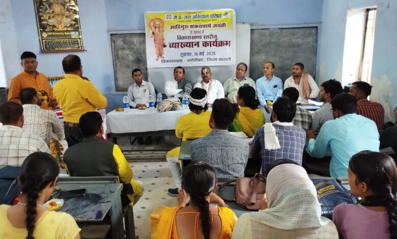 कटनी – मध्यप्रदेश जन अभियान परिषद विकासखंड बहोरीबंद अध्ययन केंद्र के माध्यम से मुख्यमंत्री सामुदायिक नेतृत्व क्षमता विकास कार्यक्रम के तहत चलाये जा रहे समाज कार्य में स्नातक, स्नातकोत्तर बीएसडब्ल्यू , एमएसडब्ल्यू पाठ्यक्रम (सामुदायिक नेतृत्व क्षमता विकास एवं सतत विकास सहित) के छात्र-छात्राओं, नवांकुर संस्थाओं के प्रतिनिधियों, प्रस्फुटन समिति के अध्यक्ष, सचिव एवं समाजसेवियों के द्वारा विकासखंड स्तरीय आदि शंकराचार्य की जयंती पखवाड़ा के अवसर पर व्याख्यानमाला कार्यक्रम का आयोजन किया गया।