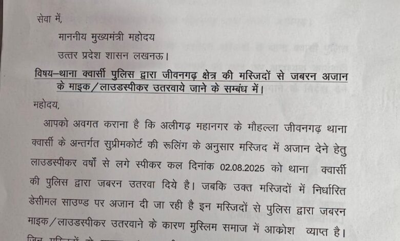 महानगर अध्यक्ष विधान सभा अध्यक्ष, वॉर्ड अध्यक्षों, जिला व महानगर के समस्त पदाधिकारियों, तथा मजलिस के साथियों से गुजारिश है। कि जीवनगढ़ क्षेत्र की मस्जिदों के माइक/ लाउडस्पीकर थाना प्रभारी क्वार्सी द्वारा जबरन यह कहकर उतरवाए हैं। 5 अगस्त को उत्तर प्रदेश के मुख्यमंत्री योगीजी आ रहे हैं। जो कि गलत है। इसी मसले को लेकर माननीय मुख्यमंत्री जी को ऑल इंडिया मजलिस ए इत्तेहादुल मुस्लिमीन पार्टी अलीगढ़ द्वारा एक ज्ञापन कलेक्ट्रेट अलीगढ़ पर दिया जाएगा। अतः आप सभी मजलिस के साथियों से गुजारिश है कि कल दिनांक 5 अगस्त 2025 सुबह 10 बजे राम रहीम फुटपाथ लघु व्यापारी समिति जमालपुर अलीगढ़ निकट मदर टेरेसा पर पहुंचने का कष्ट करें। नोट सभी पदाधिकारी अपने गले में पार्टी का हरा गमछा डालकर आएं। तथा समय का खास ख्याल रखें। निवेदक यामीन खान अब्बासी पूर्व पार्षद, ज़िला अध्यक्ष ए आई एम आई एम अलीगढ़। बुंदू खान नेताजी पूर्व पार्षद, महानगर अध्यक्ष ए आई एम आई एम अलीगढ़।