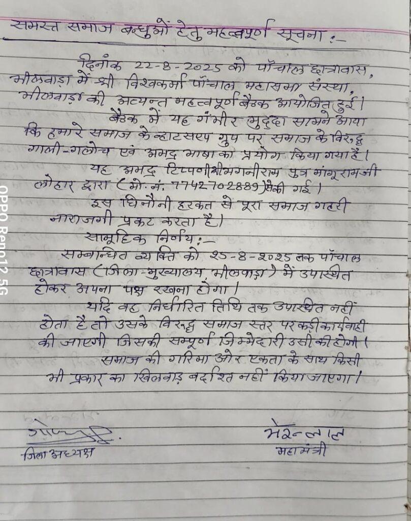 पांचाल छात्रावास तिलक नगर में 22 अगस्त गुरुवार को समाज कि बैठक हुई जिसमे गम्भीर तथ्य सामने आया कि समाज द्वारा वाट्सअप ग्रुप चल रहा जिसमें समाज का एक व्यक्ति मगनीराम पुत्र मांगूराम लोहार द्वारा ग्रुप में समाज को गाली गलौज ओर अभद्र भाषाओं का प्रयोग किया जिससे पूरी समाज में आक्रोश फैल चुका सर्वसम्मति से निर्णय लिया कि संबंधित व्यक्ति को 25 अगस्त तक जिला मुख्यालय पांचाल छात्रावास तिलक नगर भीलवाड़ा में समाज के समक्ष उपस्थित होकर इसका स्पष्टीकरण देना अनिवार्य है अगर वह व्यक्ति निर्धारित समय पर उपस्थित नहीं होता है तो उनके खिलाफ समाज स्तर पर कड़ी से कड़ी कार्यवाही की जाएगी जिसकी पूरी जिम्मेदारी मगनीराम पुत्र मांगूराम लोहार की होगी समाज का कहना है कि जो भी समाज के खिलाफ चलेगा समाज उसके खिलाफ हमेशा खड़ी रहेगी