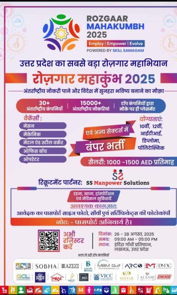 लखनऊ इन्द्राप्रतिष्ठान मे 26 अगस्त 2025 से 28 अगस्त तक अंतराष्ट्रीय नौकरी पाने और विदेश में सुनहरा भविष्य बनाने का मौका 30 से ज्यादा अंतर्राष्ट्रीय कम्पनियाँ वैकेंसी मेसन मकेनिक स्टील वर्कर आँफिस बाँय आपरेटर को देश विदेश मे जाने वा कमाने का सुनहरा अवसर है 15000 अंतराष्ट्रीय नौकरियाँ वा भारत की टाप कम्पनियाँ द्वारा मौके पर ही प्लेसमेंट देगी सैलरी 1000से 1500 Aed प्रतिमाह रहना खाना ट्रांसपोर्टेशन एवं मेडिकल सुविधा आवश्यकतानुसार कागजात जैसे आवेदक का पासपोर्ट साईज फोटो सीवी एवं सर्टिफिकेट की फोटो काँपी पासपोर्ट अनिवार्य है सभी बेरोजगार पहुँच कर हिस्सा मे भाग लेने वा सुनहरा अवसर पाने लिए सभी का स्वागत वा अभिनन्दन है