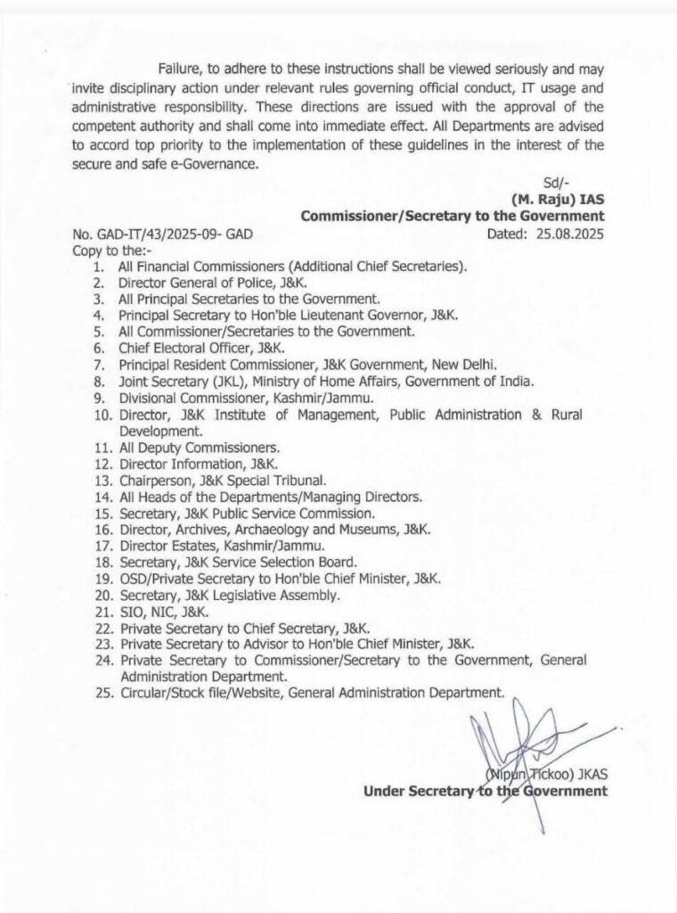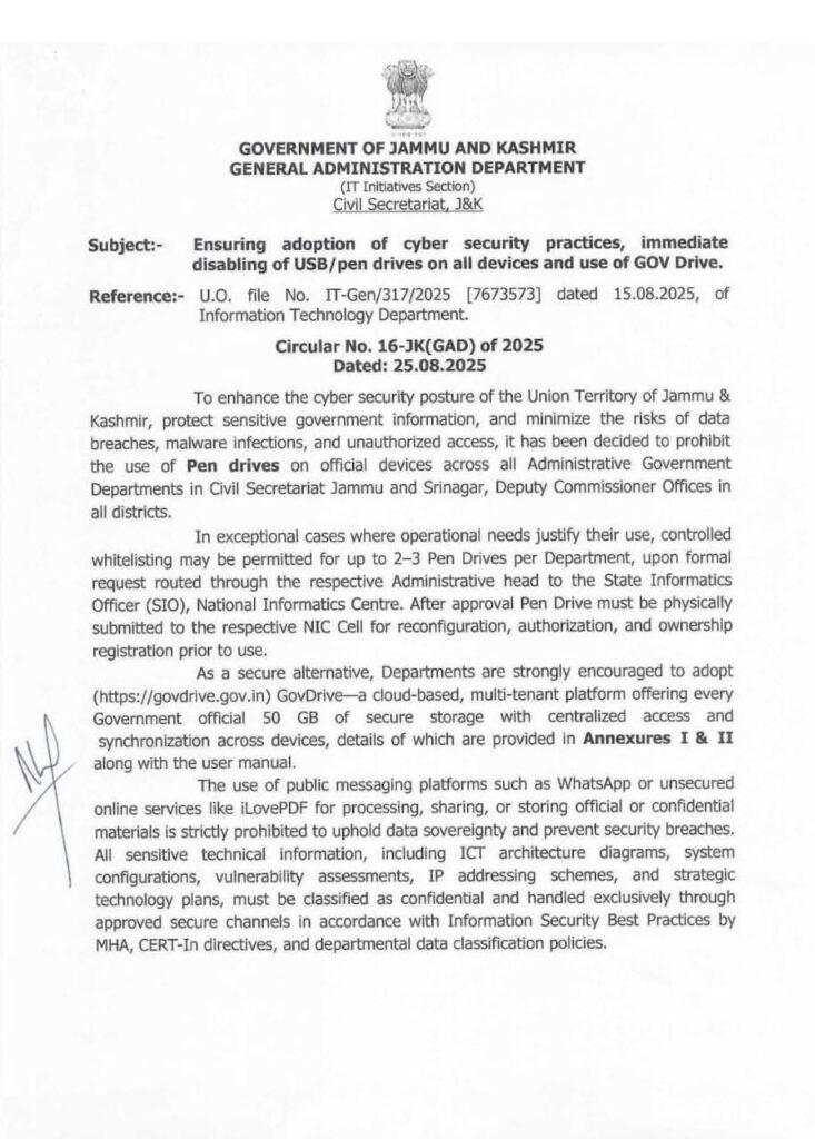 The Jammu and Kashmir administration has issued an official order banning the use of pen drives (USB storage devices) on all government computers and official devices across the Union Territory.