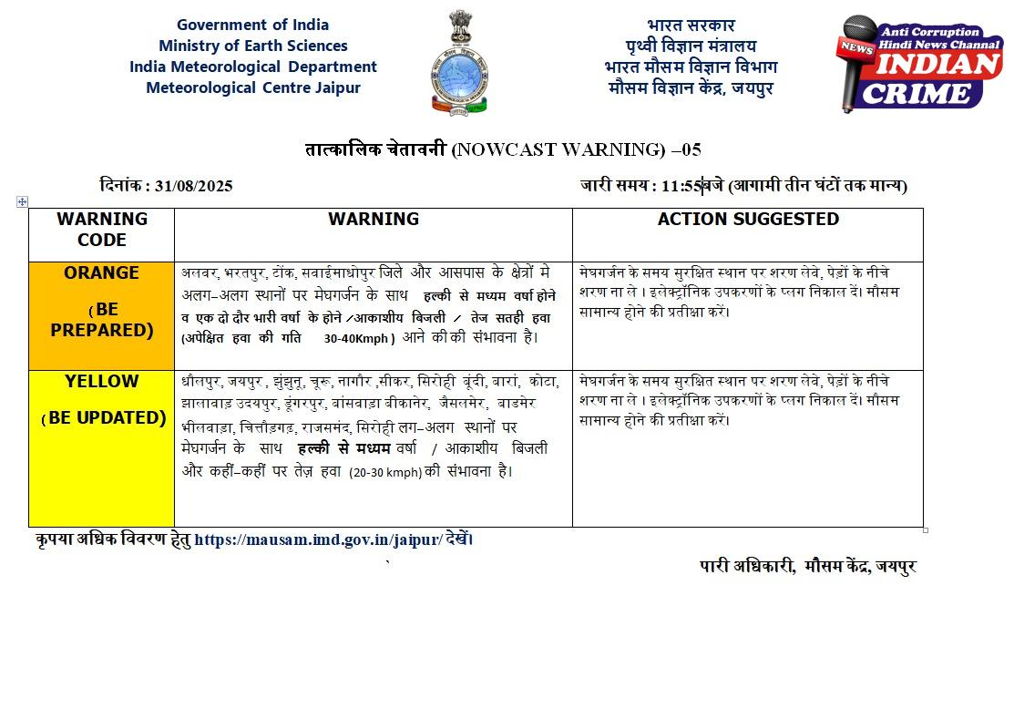 *🔷आज 31 अगस्त को राज्य के अधिकांश भागों में मानसून सक्रिय रहने व मेघगर्जन के साथ मध्यम से कहीं-कहीं तेज बारिश होने की संभावना है। आज बीकानेर संभाग, शेखावाटी क्षेत्र, जयपुर, उदयपुर, भरतपुर, जोधपुर संभाग में कहीं-कहीं भारी व अतिभारी बारिश होने की संभावना है।*