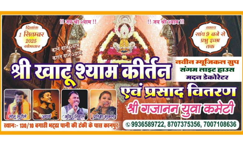 इस पावन अवसर पर श्रद्धालुओं और नगरवासियों के लिए श्री खाटू श्याम कीर्तन एवं प्रसाद वितरण का आयोजन किया जाएगा। कार्यक्रम का शुभारंभ रात 9 बजे से होगा और यह प्रभु इच्छा तक चलता रहेगा। कीर्तन में विशेष प्रस्तुति देंगे सोनू सुरिली जी अथर्व जी कुंवर निहाल जी प्रतीक्षा शुक्ला जी कार्यक्रम में नवीन म्यूजिकल ग्रुप संगीत की प्रस्तुति देगा तथा सजावट का कार्य संगम लाइट हाउस और मदन डेकोरेटर द्वारा किया जाएगा। आयोजक समिति ने श्रद्धालुओं से अधिक से अधिक संख्या में पधारकर कार्यक्रम की शोभा बढ़ाने और श्री गणेश व श्री श्याम का आशीर्वाद प्राप्त करने का निवेदन किया है। कार्यक्रम की रूपरेखा श्री खाटू श्याम का कीर्तन – सोमवार, 01 सितम्बर 2025 विशाल भण्डारा – बुधवार, 03 सितम्बर 2025 मूर्ति विसर्जन – गुरुवार, 04 सितम्बर 2025 स्थान : 130/10, बगाही भट्टा, किदवई नगर, नियर पानी की टंकी, कानपुर संपर्क : 9936589722, 8707375356, 7007108636
