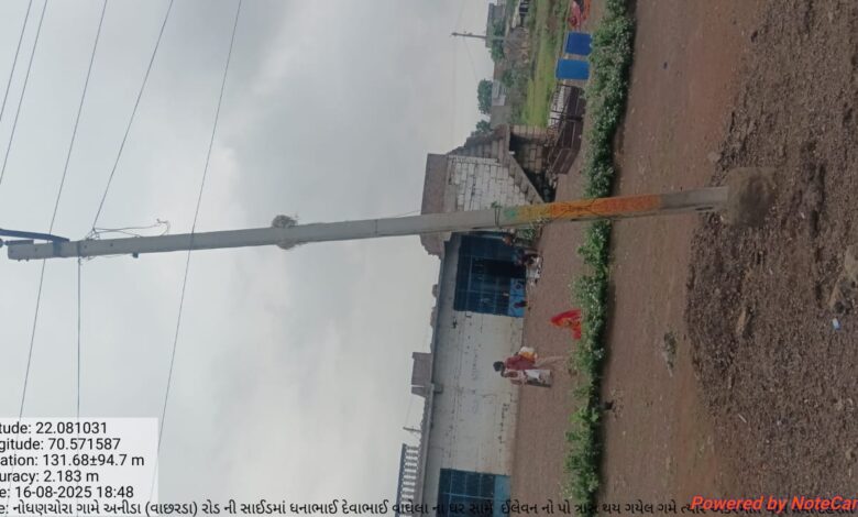 રાજકોટ જિલ્લાનું કોટડા સાંગાણી તાલુકા નો ગામનોઘણચોરા થી અનિડા વાછરા જતા દેવીપુજક વિસ્તારમાં ધનજીભાઈ રેવાભાઈ વાઘેલા ના ઘર સામે નમી ગયેલ છે ગમે ત્યારે અકસ્માત થાય તેમ છે એ પહેલા આ પોલને રીપેરીંગ કરવા હજી સુધી કોઈ કામ કરેલ નથી એ માટે તાત્કાલિક ત્રાસો પોલ હજુ સુધી પોલ ને સીધો કરેલ નથી એ માટે યોગ્ય કરશો