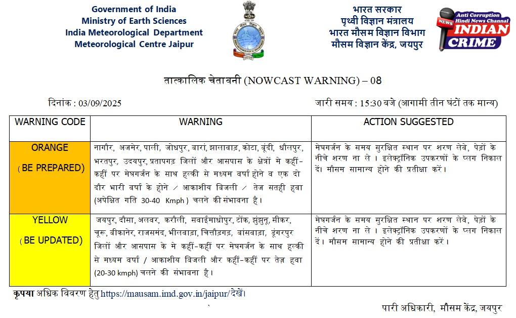 *🔷उपरोक्त के असर से आज से ही बारिश की गतिविधियों में बढ़ोतरी होने की प्रबल संभावना है। आगामी 3-4 दिन पूर्वी व दक्षिण-पूर्वी भागों के कोटा, उदयपुर, भरतपुर, अजमेर, जयपुर संभाग के कुछ भागों में मध्यम से भारी व कहीं-कहीं अति भारी बारिश होने की संभावना है।*