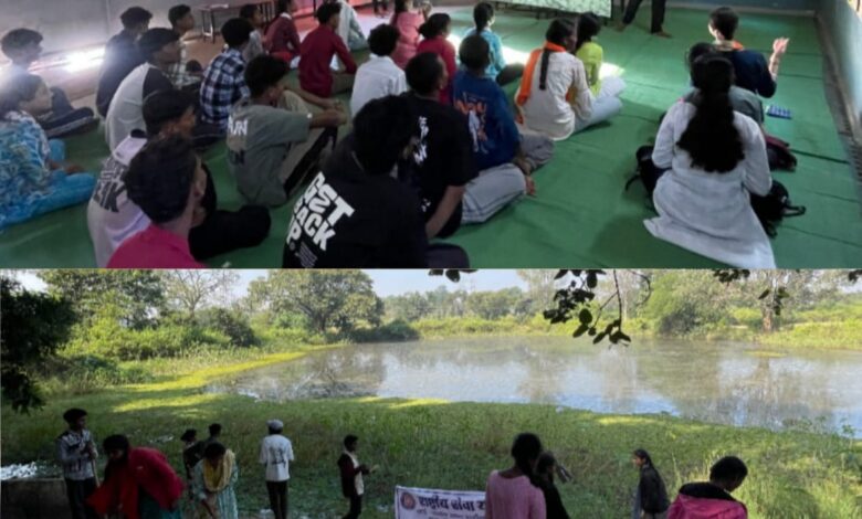 राष्ट्रीय सेवा योजना के स्वयं सेवक सात दिवसीय शिविर लगाकर कर रहे श्रमदान