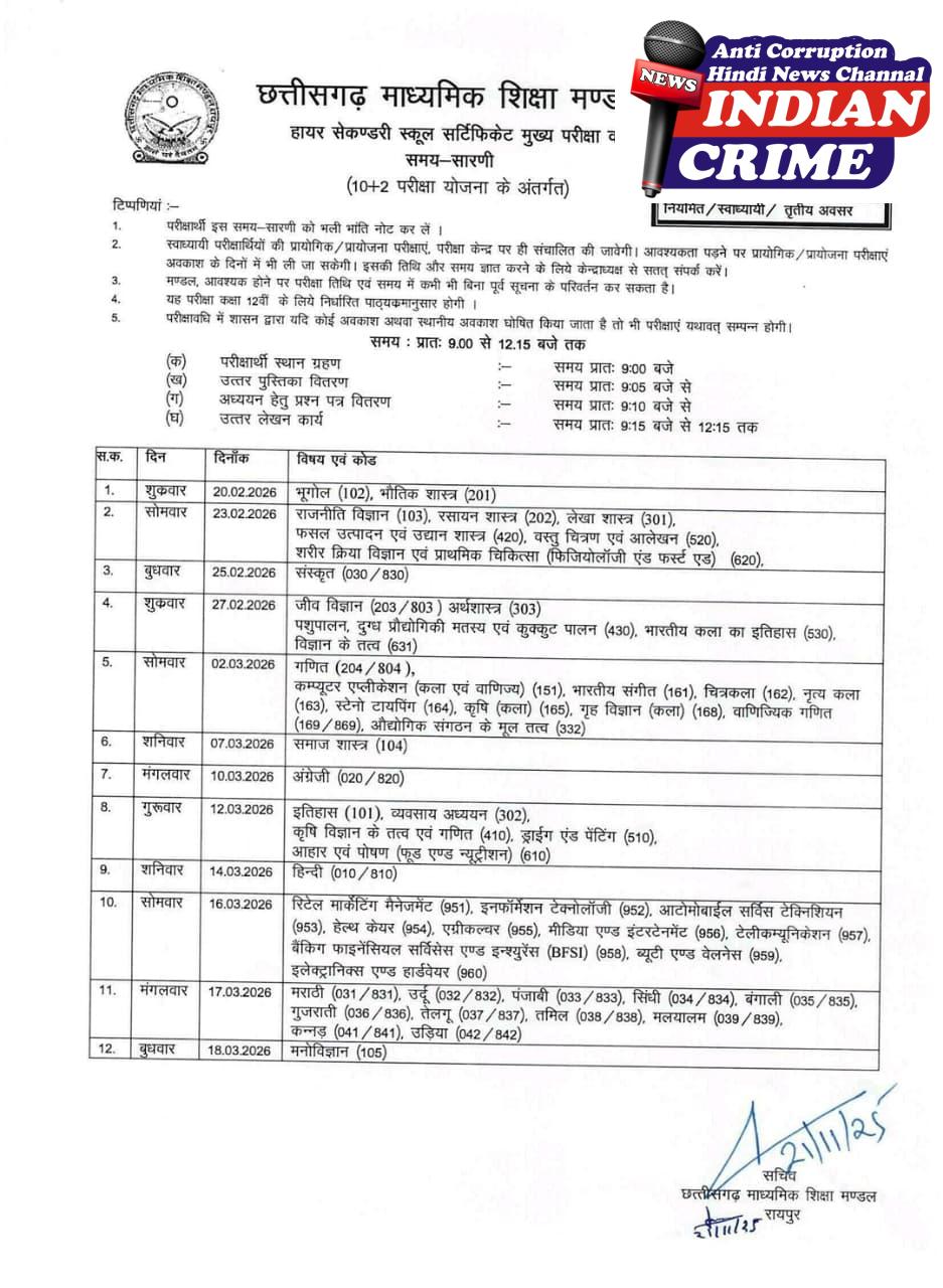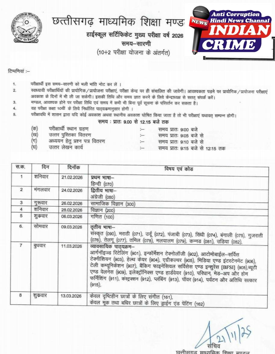 छत्तीसगढ़ माध्यमिक शिक्षा मण्डल रायपुर द्वारा कक्षा 10 वी 12वीं बोर्ड परीक्षा 2026 की समय सारणी जारी कर दी गई है कक्षा 12 वी की परीक्षा 20 फरवरी से शुरू होगी