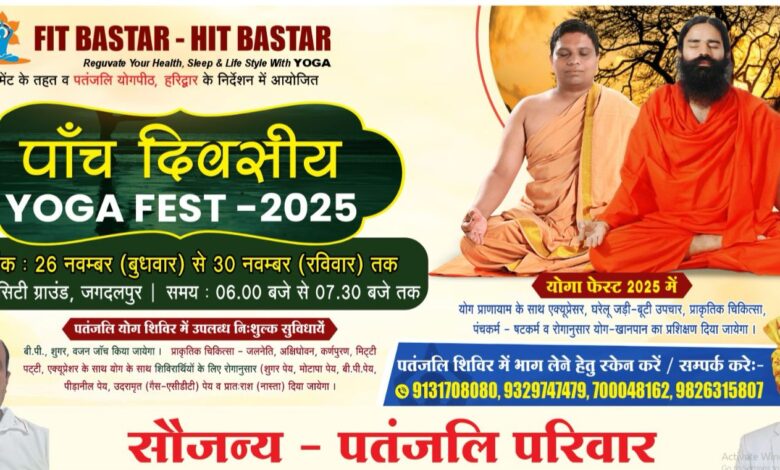 पतंजलि योग परिवार जगदलपुर बस्तर के द्वारा आज २५ दिवसीय सह योग शिक्षक शिविर की भव्य दिव्य आयोजन के साथ २६ नवंबर से ३० नवंबर२०२५ नगरवासियों के लिए विशाल पंचदिवसीय इंटीग्रेटेड योग शिविर का आयोजन किया जा रहा है जिसमे अनेक जटिल रोगों के साथ लाइफस्टाइल रोगों का प्रामाणिक उपचार बताया जाएगा, जिसमे शुगर, बीपी मोटापा थायरॉइड,माहवारी संबंधी रोग,गैस-ऐसिडिटी, गठिया वात, सर्दी खांसी बुख़ार,दर्द आदि के यौगिक उपचार के साथ साथ ख़ानपान, एक्यूप्रेशर, जलनेती, अक्षिधोवन, कर्णपूरण, मिट्टीपट्टी आदि प्राकृतिक चिकित्सा कराया जायेगा और वही रोगानुसार औषधीय पेय जिसमें शुगर रोगियों के लिए मधुमेह पेय, हार्टरोग बीपी कोलेस्ट्रॉल रोगी के लिए हिरदयपेय,गठिया वात जोड़ो का दर्द हेतु पीडांतक पेय,अस्थमा सर्दी खाँसी बुख़ार रोग प्रतिरोधक हेतु इम्यूनोपेय,उदररोग फैटीलीवर,गैस एसिडिटि अल्सर आदि के लिए उदारमृत पेय ऐसे पाँच प्रकार के पेय और अंकुरित प्रातःराश निःशुल्क प्रदान किया जाएगा।योग शिविर प्रातः ६-७:३० बजे तक सिटी ग्राउंड , जगदलपुर में पाँच दिनों तक होगी, बड़ी संख्या लोग जगदलपुर सहित बस्तर के अन्य ज़िले से भी भाग लेंगे।छत्तीसगढ़ पतंजलि योग समिति के प्रदेश अध्यक्ष डा मनोज पानीग्राही ने संवाददाता को बताया कि इस 26 नवंबर बुधवार से होने वाले पाँच दिवसीय इंटीग्रेटेड योग शिविर में रोगानुसार योगौपचार द्वारा प्रामाणिक लाभ का आकलन प्रतिदिन बीपी शुगर वजन आदि जाँच कर किया जावेगा,जिसके लिये रोगियों को हज़ारों रुपये खर्च करने पड़ते हैं जो इस शिविर प्रतिभागियों के लिए निःशुल्क होगा। इस शिविर में सभी वर्ग के बच्चे महिला-पुरुष पतंजलि द्वारा नगर में संचालित योग कक्षा में पंजीयन करा भाग ले सकते हैं।इस “योगाफ़ेस्ट- 2025”को लेकर स्वास्थ्य प्रेमियों में ख़ासा उत्साह देखा जा रहा है,शिविर को सफल बनाने में ज़िला व पुलिस प्रशासन का विशेष सहयोग मिल रहा है।पतंजलि योग समिति के संवादप्रभारी व कोषाध्यक्ष वैभव यादव ने नगरवासियों से सपरिवार भाग लेने की अपील करते हुए कहा कि आज हर कोई बीमारी के चंगुल में फँसता जा रहा है,यह शिविर उनके लिए वरदान सिद्ध होगा ।