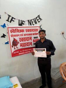 जिसमें संस्था के छात्र/छात्राओं द्वारा बड़ी संख्या में रक्तदान किया गया। कार्यक्रम का संचालन संस्था की एन०सी०सी० अधिकारी कु० वंदना जांगड़े द्वारा किया गया।
