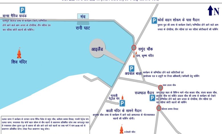 (1) मंचासीन व अन्य अतिथियों के वाहनों की पार्किंग दलपत सागर रानी गोदिया बाड़ा में रहेगा