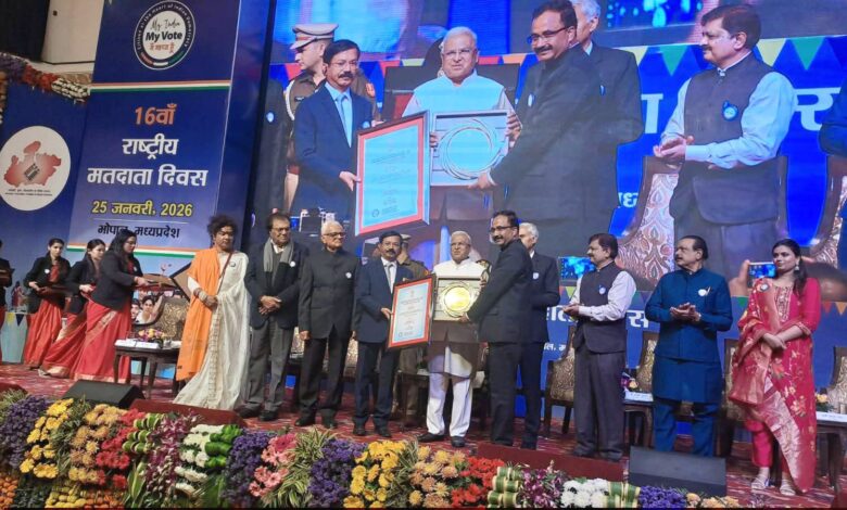राज्यपाल मंगुभाई पटेल के मुख्य आतिथ्य में कुशाभाऊ ठाकरे सभागार भोपाल में राज्य स्तरीय आयोजन किया गया। इस अवसर पर राज्यपाल महोदय द्वारा विशेष गहन पुनरीक्षण अभियान 2026 में उत्कृष्ट कार्य करने वाले अधिकारियों कर्मचारियों, ट्रेनर्स, बूथ लेवल आफिसर एवं स्वयं सेवकों को सम्मानित किया गया । कलेक्टर एवं जिला निर्वाचन अधिकारी भोपाल कौशलेंद्र विक्रम सिंह को तकनीकी नवाचार विशेष पुरस्कार से सम्मानित किया गया। इसी श्रेणी में भोपाल जिले के उप जिला निर्वाचन अधिकारी को भी तकनीकी नवाचार के लिए विशेष रूप से सम्मानित किया गया।उप जिला निर्वाचन अधिकारी भुवन गुप्ता को भोपाल के प्रभावी निर्वाचन प्रबंधन के लिए पुरस्कार प्रदान कर सम्मानित किया गया।