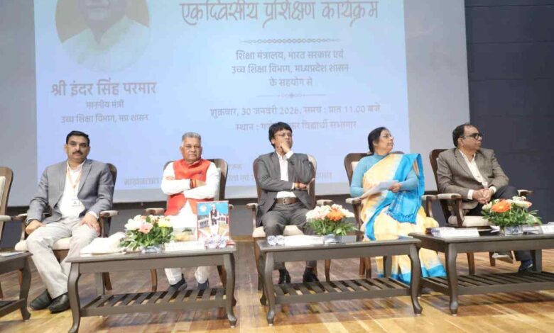 उच्च शिक्षा मंत्री इन्दर सिंह परमार, शुक्रवार को भोपाल स्थित माखनलाल चतुर्वेदी राष्ट्रीय पत्रकारिता एवं संचार विश्वविद्यालय के गणेश शंकर विद्यार्थी सभागार में, अखिल भारतीय उच्च शिक्षा सर्वेक्षण AISHE Survey 2025-26 के प्रभावी एवं सफल क्रियान्वयन के परिप्रेक्ष्य में आयोजित एक दिवसीय प्रशिक्षण कार्यक्रम का शुभारम्भ अवसर पर संबोधित कर रहे थे। मंत्री परमार ने कहा कि आने वाला समय डाटा का है और इस सर्वेक्षण में विभिन्न संस्थानों में विद्यार्थियों का सुव्यवस्थित डाटा एकत्र कर, प्रदेश को देश भर में अग्रणी बनाने के लिए परिश्रम करने की आवश्यकता है। राष्ट्रीय शिक्षा नीति-2020 भारत केंद्रित है और भारतीय दर्शन, मूल्यों तथा वसुधैव कुटुम्बकम् की भावना को सशक्त रूप से प्रस्तुत करती है। राष्ट्रीय शिक्षा नीति-2020 के क्रियान्वयन में प्रदेश अग्रणी है, इसके परिप्रेक्ष्य में भारतीय ज्ञान परम्परा पर व्यापक क्रियान्वयन हो रहा है। मंत्री श्री परमार ने बताया कि उच्च शिक्षा में प्रथम वर्ष के पाठ्यक्रम में भारतीय ज्ञान परम्परा का समावेश किया गया है। विकसित भारत 2047 का संकल्प, शिक्षा के मंदिरों को पुनः विश्व के सर्वोच्च ज्ञान के केंद्र बनाने का संकल्प है। शिक्षा के मंदिरों से, वसुधैव कुटुंबकम् का भाव मजबूत होगा। कहा कि प्राचीन ऐतिहासिक तथ्यों, धरोहरों और परंपराओं को वर्तमान ज्ञान से जोड़कर आगे बढ़ने वाले मीडिया संस्थान जैसे माखनलाल चतुर्वेदी राष्ट्रीय पत्रकारिता एवं संचार विश्वविद्यालय, विकसित भारत 2047 के लक्ष्य को साकार करने में महत्वपूर्ण भूमिका निभाएंगे। विश्वविद्यालय द्वारा सौ वर्षों की धरोहरों पर आधारित समाचार पत्रों की ऐतिहासिक सुर्खियों का संरक्षण एक सराहनीय और अनुकरणीय कार्य है। उन्होंने स्वतंत्रता आंदोलन में योगदान देने वाले महापुरुषों को श्रद्धापूर्वक स्मरण करने और उनके बताए मार्ग पर चलने का आह्वान किया। पुण्यतिथि के अवसर पर राष्ट्रपिता महात्मा गांधी और राष्ट्रकवि माखनलाल चतुर्वेदी को नमन करते हुए कहा कि दोनों विभूतियों का राष्ट्र को जागृत करने में अतुलनीय योगदान रहा है। कुलगुरु ने बताया कि आगामी जुलाई सत्र से डिजिटल मार्केटिंग एवं फाइनेंशियल अकाउंटिंग के दो नए पाठ्यक्रम प्रारंभ किए जाएंगे, जिनमें एआई टूल्स, टैली तथा मीडिया की आवश्यकताओं के अनुरूप पाठ्यवस्तु को शामिल किया जाएगा। उन्होंने पीजीडीसीए एवं डीसीए पाठ्यक्रमों को रोजगार में वरीयता देने तथा संबद्ध अध्ययन संस्थाओं के छात्रों को छात्रवृत्ति प्रदान करने का सुझाव भी रखा।नोडल अधिकारी एवं सहायक कुलसचिव ने कहा कि संस्थानों द्वारा प्रस्तुत किए गए डेटा के आधार पर ही शासन की योजनाएं बनती हैं, इसलिए AISHE पोर्टल पर स