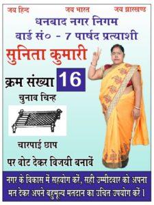 धनबाद नगर निगम के वार्ड संख्या 7 से पार्षद प्रत्याशी सुनिता कुमारी ने चुनावी मैदान में उतरकर क्षेत्र के विकास का संकल्प लिया है। उन्हें चुनाव में क्रम संख्या 16 – चारपाई छाप चुनाव चिन्ह आवंटित किया गया है।