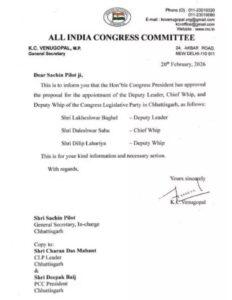 इसी क्रम में कांग्रेस विधायक दल में लखेश्वर बघेल को उपनेता, डलेश्वर साहू को मुख्य सचेतक एवं दिलीप लहरिया को उप सचेतक नियुक्त किया गया है। लखेश्वर बघेल की इस महत्वपूर्ण नियुक्ति से बस्तर सहित पूरे प्रदेश के कांग्रेस कार्यकर्ताओं एवं आम जनता में उत्साह का माहौल है, पार्टी नेतृत्व द्वारा उन पर व्यक्त किया गया यह विश्वास निश्चित ही संगठन को मजबूती प्रदान करेगा तथा विधानसभा में जनहित के मुद्दों को प्रभावी ढंग से उठाने में सहायक सिद्ध होगा।