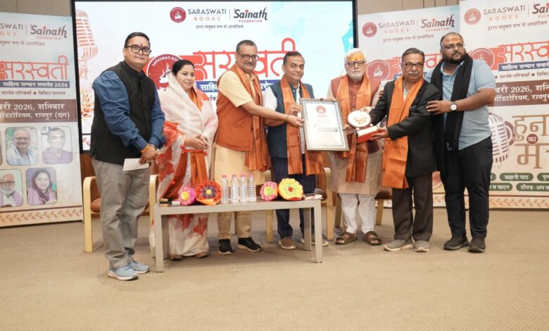 21 फरवरी 2026 को विमतारा ऑडिटोरियम,शांति नगर रायपुर में सरस्वती साहित्य महोत्सव का वृहद आयोजन किया गया था l यह आयोजन सरस्वती प्रकाशन भिलाई तथा सांईनाथ फाउंडेशन के संयुक्त तत्वावधान में आयोजित किया गया था l इस अवसर पर छत्तीसगढ़ के साहित्यिक विभूतियों को सम्मानित किया गया l इस साहित्य महोत्सव में जगदलपुर के सुप्रसिद्ध साहित्यकार रुद्र नारायण पाणिग्राही को सरस्वती साहित्य सम्मान से सम्मानित किया गया l यह सम्मान साहित्य के क्षेत्र में दीर्घकालीन सेवाओं तथा विशिष्ट उपलब्धियों के लिए दिया गया l इस अवसर पर शाल, श्रीफल, सम्मान पत्र, मोमेंटो, तथा 11000 रुपए नगद राशि पुरस्कार स्वरूप दिए गए l छत्तीसगढ़ के उक्त ग्रुप के द्वारा कला साहित्य व संगीत के क्षेत्र में विशेष योगदान के लिए प्रतिवर्ष लोगों को सम्मानित करती आ रही है l इस वर्ष सरस्वती साहित्य सम्मान 2026 का रुद्र नारायण पाणिग्राही वरिष्ठ लेखक व इतिहासकार को प्रदान किया गया l यह सम्मान छत्तीसगढ़ साहित्य अकादमी के अध्यक्ष शशांक शर्मा, राजभाषा आयोग के अध्यक्ष प्रभात मिश्रा तथा श्रीमती नजमा खान के कर कमलों से प्रदान किया गया l उक्त कार्यक्रम में परिचर्चा के दो सत्र, ओपन माइक तथा सरस्वती नव लेखक सम्मान भी दिया गया l यह नव लेखक सम्मान छत्तीसगढ़ से 20 युवा लेखकों को प्रदान किया गया l, सरस्वती नव लेखक सम्मान जगदलपुर के सौरभ आचार्य को भी प्रदान किया गया है l