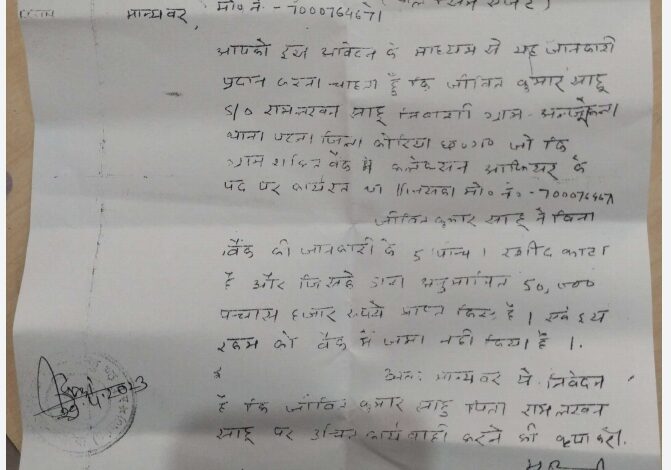 बैकुंठपुर थाना क्षेत्र अंतर्गत एक ग्राम शक्ति नामक माइक्रो फाइनेंस बैंक जो प्राइम सर्विस प्राइवेट लिमिटेड द्वारा संचालित है जहां शिकायत अनुसार बताया गया कि जीवित कुमार साहू पिता राम लखन साहू निवासी ग्राम अंजोकला थाना पटना जिला कोरिया छत्तीसगढ़ जो इस संस्था में कलेक्शन ऑफिसर के पद पर कार्यरत था जिसके द्वारा माइक्रो फाइनेंस ग्राम शक्ति के द्वारा वित्त पोषित विभिन्न समूह से लगभग पचास हजार रुपए का कलेक्शन करने के पश्चात बैंक को बिना जानकारी दिए रसीद काटने के बाद बैंक में पैसा जमा नहीं किया गया है मिली जानकारी अनुसार रसीद नम्बर 10198401 से लेकर 10198405 तक कुल 5 रसीद, रसीद क्रमांक 8407937 का काटे गए रसीद के पैसे की जानकारी शाखा को नहीं देकर कि वह शाखा से कहीं फरार हो गया है जिसकी शिकायत प्राइम सर्विस प्राइवेट लिमिटेड के एरिया मैनेजर नरेंद्र कुमार श्रीवास्तव के द्वारा बैकुंठपुर थाना में शिकायत कर उचित कार्यवाही करने की मांग किए हैं वही नरेंद्र कुमार श्रीवास्तव एरिया मैनेजर के द्वारा बताया गया कि जीवित कुमार साहू पिता रामलखन साहू का वित्तीय अनियमितता की जानकारी संस्था को प्राप्त होने के पश्चात उन्हें उनके पद से पृथक किया जा चुका है तथा जिस की जानकारी बैकुंठपुर थाना को देकर उचित कार्यवाही करने की मांग किया गया है वर्तमान में उक्त व्यक्ति का शाखा से कोई संबंध नहीं है समस्त ग्राम शक्ति के वित्त पोषित विभिन्न समूह के समस्त सदस्यों एवं ग्रामीण जनों को सूचित किया जाता है कि शाखा से जीवित कुमार साहू का किसी प्रकार की कोई क्रियाकलाप में कोई जिम्मेदारी नहीं दी गई है यदि शिकायत करने के पश्चात संबंधित क्षेत्र में जाकर पैसे की वसूली यदि उनके द्वारा किया जाता है तो शाखा की कोई जिम्मेदारी नहीं रहेगी जानकारी दिए जाने के पश्चात यदि किसी प्रकार की पैसा उक्त व्यक्ति को देते हैं तो उसके जिम्मेदार स्वयं होंगे