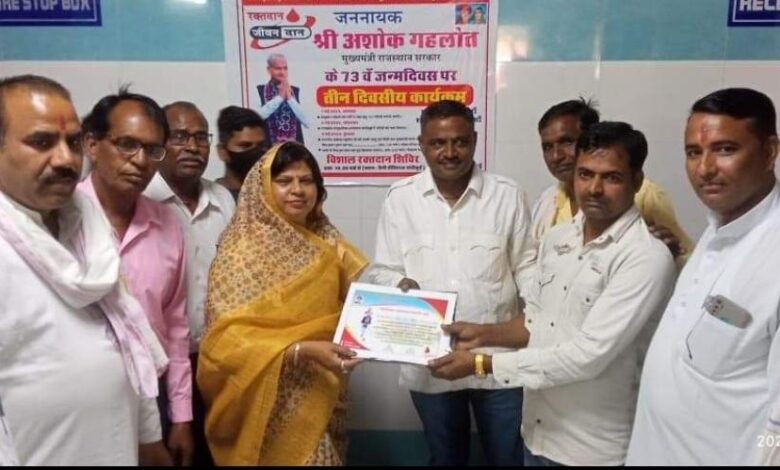 जननायक मुख्यमंत्री अशोक गहलोत जी के 73वे जन्मदिन के उपलक्ष्य मे तीन मई को सैनी अस्पताल बांदीकुई मे विशाल रक्तदान शिविर का आयोजन किया गया है रक्तदान शिविर शुरू होने के बाद रक्तदान करने वालो भीड़ शुरू हो गई है इसमे भागचन्द टाकडा व अन्य लोगों ने भी रक्तदान किया गया। रक्तदान करने वाले सभी लोगों को सैटेविटिक दिया गया। इस दौरान नगरपालिका चेयरमैन इंदिरा देवी भागचन्द टाकडा राकेश सैनी अशोक सैनी कमलेश सैनी नन्दलाल सैनी रमेश सैनी व लोग वहां मौजूद रहे।