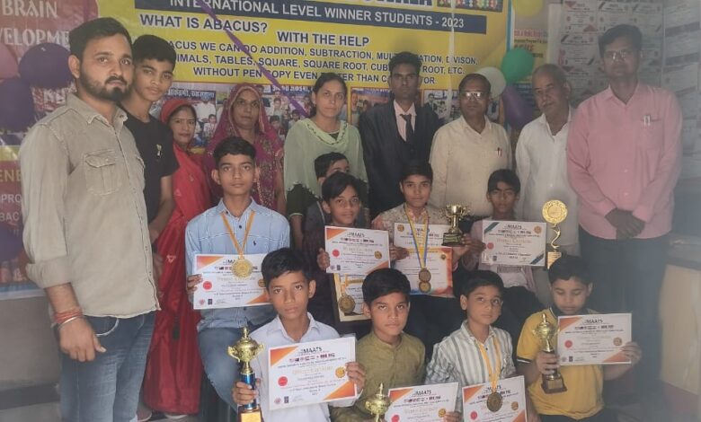 खाजूवाला : अबेकस एकेडमी खाजूवाला के बच्चो ने आर्थमेटिकल मैथ्स ऑल इंडिया टेलेंट सर्च कोलापुर (महाराष्ट्र) की ओर से आयोजित चौथे ओपन इंटरनेशनल अबेकस कांटेस्ट सीजन 4 में खाजूवाला के जयेश सचदेवा, प्रद्युम्न शर्मा व अभय ने चैंपियन खिताब जीता साथ ही ललित तावनिया, हार्दिक सारस्वत, हर्षित चौहान व जतिन प्रजापत ने प्रथम रनरअप का खिताब अपने नाम किया। तथा अबेकस एरिमेटिकल टीचर एसोसिएशन द्वारा आयोजित 13th ओपन अंतर्राष्ट्रीय अबेकस कंपटीशन में सौम्या रोलन ने लेवल में चैंपियन का खिताब लिया व नरेंद्र स्वामी ने लेवल 8th में टॉपर रैंक हासिल कर अपने क्षेत्र का नाम रोशन किया जिससे अबेकस एकेडमी खाजूवाला को आउटस्टैंडिंग परफॉर्मेंस का सर्टिफिकेट प्राप्त हुआ। एकेडमी के संचालक संतोष राजपूत व बंटी बिश्नोई ने बताया कि बच्चो ने 3 मिनट के पेपर को केवल 2 मिनट 29सेकंड में कर 9 देशों से चैंपियन व फर्स्ट रनर अप का खिताब प्राप्त किया।