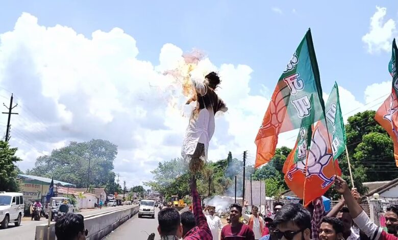 नारायणपुर – नगर के जयस्तंभ चौक मे प्रदेश नेतृत्व के आव्हान पर भाजयुमो व बजरंग दल की अगुवाई मे अखिल भारतीय कमेटी अध्यक्ष मलिकार्जुन खड़गे व प्रदेश के मुख्यमंत्री भूपेश बघेल का पूतला फूंका व जमकर नारेबाजी की। दरअसल कर्नाटक में आने वाले दिनों में चुनाव है कर्नाटक कांग्रेस पार्टी अपने चुनावी घोषणापत्र मे चुनाव मे जीत मिलने के बाद कांग्रेस बजरंग दल को आंतकवाद से तुलना करते पूर्ण रूप से प्रतिबंधित करने का वादा वहा के मतदाताओं से किया गया है। कांग्रेस के घोषणा पत्र के दर्ज इस बिंदु को लेकर भाजयुमो व बजरंग दल में कड़ी प्रतिक्रिया देखी जा रही है। इसी क्रम मे आज भाजयुमो व बजरंग दल के कार्यकर्त्ता संयुक्तरूप से खड़गे व भूपेश बघेल का पुतला फूंका और जमकर नारेबाजी की।इस दौरान मीडिया को दिए बयान मे भाजयुमो जिलाध्यक्ष पंकज जैन ने कहा की विगत दिनों कर्नाटक चुनाव को लेकर कांग्रेस ने चुनाव मे जीत मिलने पर राज्य मे बजरंगदल को प्रतिबंधित करने का वादा किया है।जिसके बाद छतीसगढ़ के मुख्यमंत्री भूपेश बघेल ने भी बजरंगदल मे प्रतिबन्ध लगाने जैसा बयान दिया है जो की पूर्णत: निंदनीय है जिसका हम कड़े शब्दों ने विरोध करते है। बजरंग दल एक सामाजिक संगठन है जो हमेशा से हिन्दूहित के कार्य करता है। कांग्रेस नेताओं का ऐसा बयान उनकी हिन्दुओं के प्रति घटिया मानसिकता को दर्शाता है।इस अवसर पर भाजपा नेता बृजमोहन देवांगन, संजय नंदी,प्रताप मंडावी,किशोर आर्य, गोपाल दुग्गा,अभिषेक बेनर्जी, अविनाश देवांगन, दिपेन्द्र भोयर, बिस्सू दत्ता, मोनू मिश्रा,नीलेश बघेल, मयंक जैन, ललित पोयाम,हेमंत भोई, उज्जवल सोनी, धनंजय बघेल, सत्येंद्र सिंह ठाकुर, मनीष ध्रुव, हरेश नाग, कोमल यदु, युधिष्ठिर मानकर, रूद्र, राजेश , गोलु साहू, तुलसी, दुवारु सहित अन्य भाजयुमो व बजरंग दल के पदाधिकारी व कार्यकर्त्ता मौजूद थे।