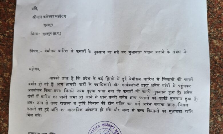 लगातार बारिश से हुई फसल का नुकसान, किसानों को मुआवजा दिलाने के लिए आप ने सौपा कलेक्टर को ज्ञापन आज सूरजपुर जिले में आम आदमी पार्टी के जिलाध्यक्ष सुरेन्द्र कुमार गुप्ता जी के नेतृत्व में जिला कलेक्टर के नाम एक ज्ञापन संयुक्त कलेक्टर को देकर बे मौसम बारिश से हुए फसलों के नुकसान का सर्वे करने और मुआवजा राशि किसानों को देने की मांग की गई l इस दौरान जिला सचिव रवि जायसवाल संगीता मरावी जिलाध्यक्ष महिला विंग, राजेन्द्र पासवान जिलाध्यक्ष एस सी विंग, छोटू दास, ब्लॉक अध्यक्ष पुनीत दुबे एवं हेमंत यादव सहित अन्य कार्यकर्त्ता उपस्थित रहे l