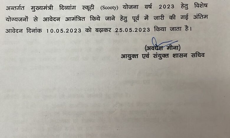 बाडमेर –धोरीमन्ना दिव्यांग स्कूटी योजना की आवेदन की तारीख सरकार द्वारा बढ़ा दी गई दिव्यांग संघर्ष समिति धोरीमन्ना के संरक्षक एवं कल्याण समिति के ब्लॉक अध्यक्ष चनणाराम नामा ने जानकारी दी कि राजस्थान सरकार बजट वर्ष 2023 -24 की घोषणा संख्या 73 के अंतर्गत मुख्यमंत्री दिव्यांग स्कूटी (Scooty) योजना 2023 हेतु विशेष योग्यजन आवेदन आमंत्रित फॉर्म भरने की तारीख 10 मार्च 2023 रखी गई थी । उसको बढ़ाकर अब सरकार ने 25 मई 2023 कर दी है इसे दिव्यांग वंचित लोगों को लाभ मिलेगा । एव ज्यादा से ज्यादा फॉर्म भरने की दिव्यांग भाइयों से अपील की । नामा ने कहा कि दिव्यांग लोग अपना फॉर्म भरे और सरकारी स्कूटी योजना में लाभ उठावे ।