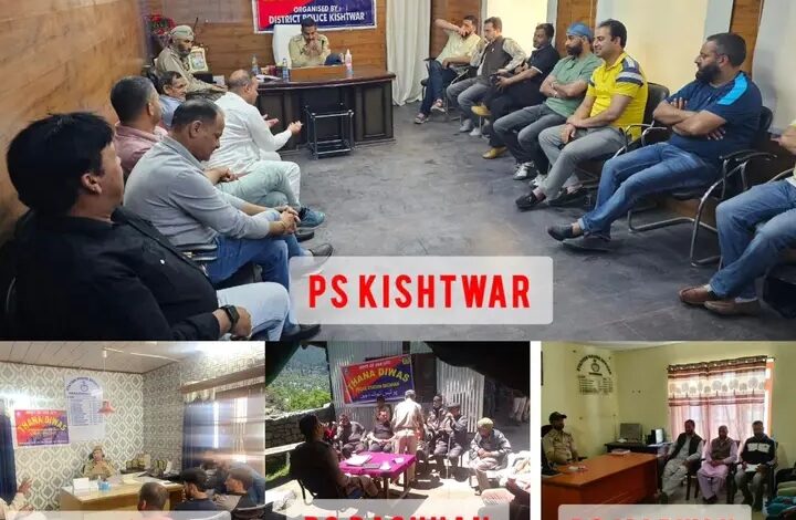 किश्तवाड़ पुलिस ने जिला किश्तवाड़ के किश्तवाड़, अथोली, दच्छन, मारवाह पुलिस स्टेशन में थाना दिवस का आयोजन किया। एसएसपी किश्तवाड़ श्री की देखरेख में ‘थाना दिवस’ कार्यक्रम आयोजित किया गया था। जिले के पुलिस थानों में एसडीपीओ और एसएचओ द्वारा खलील पोस्वाल-जेकेपीएस। थाना दिवस में विभिन्न पंचायती राज संस्थाओं के सदस्यों, नागरिक समाजों के सदस्यों, दुकानदार संघों और संबंधित क्षेत्रों के सम्मानित लोगों ने भाग लिया। बैठक के दौरान, प्रतिभागियों द्वारा कई मुद्दों को उठाया गया। अधिकारियों ने जनता की शिकायतों को धैर्यपूर्वक सुना और आश्वासन दिया कि पुलिस से संबंधित मुद्दों को प्राथमिकता पर पूरा किया जाएगा और नागरिक प्रशासन से संबंधित मुद्दों को फीडबैक रिपोर्ट के साथ शीघ्र निवारण के लिए नागरिक प्रशासन के साथ उठाया जाएगा। एसएसपी किश्तवाड़ श. खलील पोसवाल-जेकेपीएस ने अपने संदेश में प्रतिभागियों का स्वागत किया और क्षेत्र में कानून व्यवस्था बनाए रखने और राष्ट्र-विरोधी और असामाजिक तत्वों की पहचान करने में पुलिस और प्रशासन के साथ सहयोग करने की अपील की। प्रतिभागियों को ट्रेंडिंग साइबर क्राइम और साइबर अपराधियों के तौर-तरीकों से भी अवगत कराया गया।प्रतिभागियों ने ‘थाना दिवस’ के आयोजन के लिए जम्मू-कश्मीर पुलिस की पहल की सराहना की, जो उनके मुद्दों के शीघ्र निवारण में मदद करेगा।