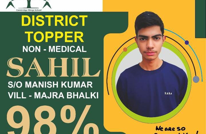 आज सीबीएसई द्वारा कक्षा 12वी का परिणाम घोषित किया गया।जिसमे जिले के चिताडुंगरा स्थित कैंब्रिज विंग्स स्कूल के विद्यार्थियों ने हर वर्ष की भांति इस बार भी अद्भुत परिणाम दिया है। विद्यालय के चेयरमैन श्री अशोक यादव जी ने बताया की विद्यालय की कक्षा 12वी के प्रतिभावान छात्र साहिल यादव पुत्र श्री मनीष यादव गांव माजरा भालखी ने विज्ञान संकाय से 98 प्रतिशत अंको के साथ पूरे रेवाड़ी जिले मे प्रथम स्थान हासिल कर अपने विद्यालय , माता पिता , गुरुजनों के साथ पूरे इलाके का नाम रोशन किया है। वाणिज्य संकाय से प्रतिभावान छात्रा नेहा पुत्री श्री वेदप्रकाश गांव चिताडुंगरा ने 95 प्रतिशत अंको के साथ शानदार परिणाम दिया ! इसी कड़ी मे कला संकाय की प्रतिभावान छात्रा स्नेहा यादव पुत्री श्री अनिल यादव गांव चिताडुंगरा ने 92 प्रतिशत अंको के साथ शानदार परिणाम दिया ।इस शानदार परिणाम से पूरे कैंब्रिज विद्यालय मे खुशी की लहर है। इसी कड़ी मे कक्षा दसवीं के विद्यार्थियों ने भी शानदार परिणाम का परिचय दिया। विद्यालय के प्राचार्य श्री महताब यादव ने बताया की विद्यार्थियों के सर्वांगीण विकास के लिए विद्यालय मे प्रतियोगात्मक परीक्षाओ के लिए विशेष कक्षाओं का संचालन बड़े ही अनुभवी अध्यापकों के द्वारा किया जाता है। इस शानदार परिणाम के लिए स्कूल निर्देशिका श्रीमती बबीना राव ने सभी विद्यार्थियों ,अध्यापकों व अभिभावकों को हार्दिक शुभकामनाएं दी और बच्चो के उज्जवल भविष्य की कामना की। इस अवसर पर सभी अध्यापकगण उपस्थित रहे।
