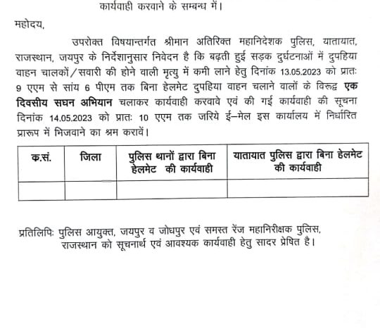 कार्यालय महानिदेशक पुलिस, राजस्थान जयपुर द्वारा राजस्थान में बढ़ती हुई सड़क दुर्घटनाओं में दुपहिया वाहन चालकों / सवारी की होने वाली मृत्यु में कमी लाने हेतु दिनांक 13.05.2023 को प्रातः 9 एएम से सांय 6 पीएम तक बिना हेलमेट दुपहिया वाहन चलाने वालों के विरुद्ध एक दिवसीय सघन अभियान चलाकर कार्यवाही करने के आदेश जारी किये गये है। जीवण सिंह किशनावत, जयपुर, राजस्थान