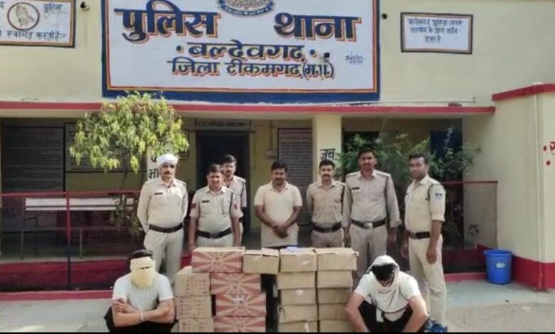पुलिस महानिरीक्षक सागर जोन सागर श्री प्रमोद वर्मा एवं उप पुलिस महानिरीक्षक छतरपुर रेंज श्री ललित शाक्यवार द्वारा अवैध मादक पदार्थों के परिवहन एवं बिक्री पर कार्यवाही करने हेतु निर्देशित किया गया है। इसी तारतम्य में पुलिस अधीक्षक टीकमगढ़ श्री रोहित काशवानी के मार्गदर्शन में थाना प्रभारी बल्देवगढ़ को मुखविर से सूचना प्राप्त हुई कि बल्देवगढ़ क्षेत्र में दो व्यक्ति एक नीले रंग की बलेनो कार से अवैध शराब रखकर विक्रय हेतु धजरई से बल्देवगढ की ओर जा रहे है । उक्त सूचना पर कार्यवाही हेतु अतिरिक्त पुलिस अधीक्षक श्री सीताराम, एसडीओपी श्री बीडी त्रिपाठी के द्वारा थाना प्रभारी अमित साहू के नेतृत्व में एक पुलिस टीम को रवाना किया गया। टीम को सूचना मिली कि बलेनो वाहन ग्राम अहार लडवारी तरफ गया है । कुछ देर बाद उक्त वाहन लौट कर अहार पुलिया पर आया । वाहन को रोका गया जिसमे 2 व्यक्ति बैठे थे। पहले व्यक्ति से नाम-पता पूछने पर उसने अपना नाम कुलदीप यादव पिता जाहर यादव उम्र 25 साल निवासी शिवराजपुर थाना देहात टीकमगढ़ का होना बताया। तत्पश्चात कुलदीप यादव की तलाशी लेने पर उसके बाएं पेंट की जेब में 32 बोर का देशी कटटा व कारतूस रखा होना पाया गया। वही दूसरे व्यक्ति से उसका नाम पता पूछा तो उसने अपना नाम देवेन्द्र यादव पिता काशीराम यादव उम्र 29 साल निवासी शिवराजपुरा थाना देहात टीकमगढ का होना बताया। तत्पश्चात आरोपी कुलदीप यादव की कब्जे वाली नीले रंग की बलेनो एमपी 36 सी 5930 की तलाशी ली गई जिसकी डिग्गी में कुल 07 पेटी( दो पेटी ब्लेक फोर्ड कम्पनी की बियर, व 05 पेटी देशी प्लेन मदिरा के क्वार्टर) रखे होना पाया गया। कुल शराब 69 लीटर कीमती 26200 रुपये की अवैध तरीके से रखे होना पाये जाने पर उक्त शराब व वाहन को जप्त किया गया व आरोपी कुलदीप यादव व देवेन्द्र यादव को गिरफ्तार किया गया। तत्पश्चात कुलदीप यादव से सख्ती से पूछताछ करने पर उसके द्वारा कुल 22 पेटियां जिनमें से 13 पेटी देशी प्लेन मदिंरा की, व 09 पेटी ब्लेक फोर्ड कम्पनी की बियर अपनी गाडी में लाना व विजय लोधी निवासी अहार पुलिया की दुकान व घर पर 04 पेटी बियर व 04 पेटियां देशी प्लेन मदिरा की विक्रय हेतु देना एवं ग्राम अहार में झगडू उर्फ रघवीर यादव के घर पर 03 पेटी बियर व 04 पेटी देशी प्लेन मदिरा की विक्रय हेतु देना बताया। उक्त सूचना प्राप्त होने पर थाने से अतिरिक्त बल को मौके पर बुलाया गया । तत्पश्चात पुलिस विजय लोधी के घर पहुंची ,तो विजय लोधी पुलिस को देख कर अंधेरे का लाभ उठाकर भाग गया। आरोपी कुलदीप यादव की निशादेही पर विजय लोधी के घर से 04 पेटी वियर व 04 पेटी देशी प्लेन मंदिरा की कुल शराब 84 लीटर कीमती 28000 रूपये की जप्त की गई। इसके बाद कुलदीप यादव की निशादेही पर ही ग्राम अहार में झगडू उर्फ रघ