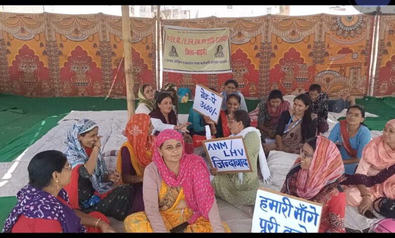 Rajasthan News कर्मी जिला मुख्यालय बाड़मेर के सामने अनिश्चितकालीन धरने पर बैठे कर्मी अपनी मुख्य तीन मांगों को लेकर अनिश्चितकालीन हड़ताल पर बैठे हुए हैं।