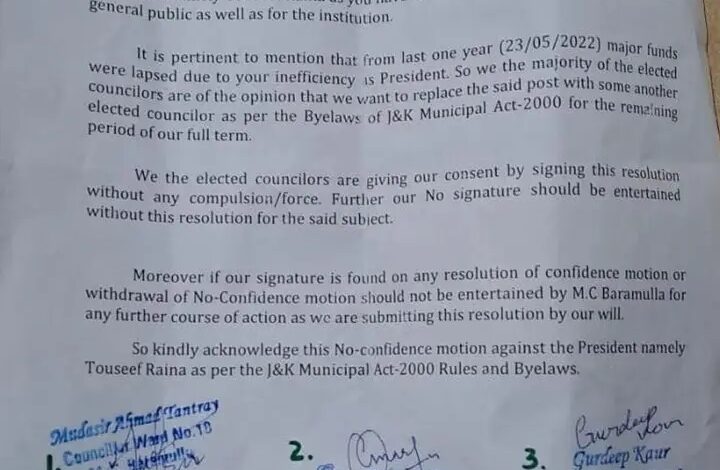 इसलिए हम में से अधिकांश हमारे पूरे कार्यकाल की शेष अवधि के लिए जम्मू-कश्मीर नगरपालिका अधिनियम -2000 के उपनियमों के अनुसार निर्वाचित निर्वाचित पार्षद। हम निर्वाचित पार्षद बिना किसी बाध्यता बल के इस प्रस्ताव पर हस्ताक्षर करके अपनी सहमति दे रहे हैं। इसके अलावा हमारे किसी भी हस्ताक्षर पर विचार नहीं किया जाना चाहिए उक्त विषय के लिए संकल्प। इसके अलावा यदि हमारे हस्ताक्षर विश्वास प्रस्ताव के किसी भी संकल्प पर पाए जाते हैं या अविश्वास प्रस्ताव को वापस लेने के लिए एमसी बारामूला द्वारा आगे की कार्रवाई के लिए विचार नहीं किया जाना चाहिए क्योंकि हम अपनी इच्छा से यह संकल्प प्रस्तुत कर रहे हैं। ” यह आगे पढ़ता है। “तो कृपया जम्मू-कश्मीर म्यूनिसिपल एक्ट -2000 के नियमों और उपनियमों के अनुसार राष्ट्रपति अर्थात् तौसीफ रैना के खिलाफ इस अविश्वास प्रस्ताव को स्वीकार करें।” यह आगे पढ़ता है।