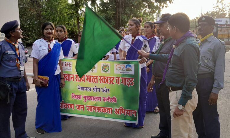 राजस्थान राज्य भारत स्काउट गाइड जिला मुख्यालय करौली के तत्वाधान में जिला स्काउट गाइड भवन में आयोजित किए जा रहे डीएलएड स्काउट गाइड ग्रुप शिविर के संभागीयो को संबोधित करते हुए अतिरिक्त जिला कलेक्टर मुरलीधर प्रतिहार ने कहा कि पर्यावरण के संरक्षण के लिए अधिकाधिक पर लगाने चाहिए सीओ स्काउट अनिल कुमार गुप्ता ने बताया की पर्यावरण संरक्षण के लिए वन पर्यावरण एवं जलवायु परिवर्तन मंत्रालय ने मुहिम शुरू की है जिसके तहत मेरी लाइफ डॉट कॉम के माध्यम से लोगों को पर्यावरण के प्रति जागरूक किया जा रहा है उसी श्रंखला में राजस्थान राज्य भारत स्काउट गाइड जिला मुख्यालय करौली के तत्वाधान में आयोजित किए जा रहे डीएलएड स्काउट गाइड ग्रुप शिविर के संभागीय ने पर्यावरण जन जागरूकता रैली का आयोजन पुरानी नगरपालिका से किया जिसको जिला कलेक्ट्रेट में अतिरिक्त जिला कलेक्टर मुरलीधर प्रतिहार ने संबोधित करते हुए कहा कि पर्यावरण संरक्षण हमारे जीवन के लिए अत्यावश्यक है पर्यावरण संरक्षण के लिए अधिकाधिक पेड़ लगाने चाहिए पेड़ों से ही हमें हमारे जीवन की आवश्यकताओं की पूर्ति होती है एवं जीवनदायिनी ऑक्सीजन प्राप्त होती है उन्होंने स्काउट गाइड से अपील की कि वह स्वयं में पेड़ लगाएं एवं अपने मित्रों परिजनों गांव वासियों को पेड़ लगाने के लिए प्रेरित करें यह सभी का नैतिक दायित्व है कि वह पर्यावरण संरक्षण में अपना योगदान प्रदान करें इससे पूर्व शिविर संचालक मुकुट बिहारी गुप्ता ने अतिरिक्त जिला कलेक्टर का संगठन की रीति के अनुसार स्कार्फ पहना कर स्वागत किया रैली पुरानी नगरपालिका से प्रारंभ होकर फूटा कोट वजीरपुर गेट कलेक्ट्री अंबेडकर सर्किल हटवाड़ा बाजार सोती हुई स्काउट गाइड भवन पर संपन्न हुई इस दौरान रैली में प्रशिक्षणार्थी बालिकाएं पर्यावरण संरक्षण से संबंधित नारे लगाते हुए चल रही थी रैली में सहायक शिविर संचालक गिर्राज सिंह ट्रेनिंग काउंसलर मेघराज माली रामदुलारी शिक्षक प्रशिक्षण विद्यालय हिंडौन सिटी की प्रधानाचार्य ज्योति शर्मा राष्ट्रपति रोवर मान प्रकाश शर्मा धर्मराज गुर्जर आदि उपस्थित थे