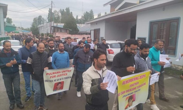 Jammu & Kashmir News नागरिक दीपू कुमार की हत्या की निंदा करने के लिए पुलवामा में कैंडल-लाइट मार्च आयोजित किया गया !