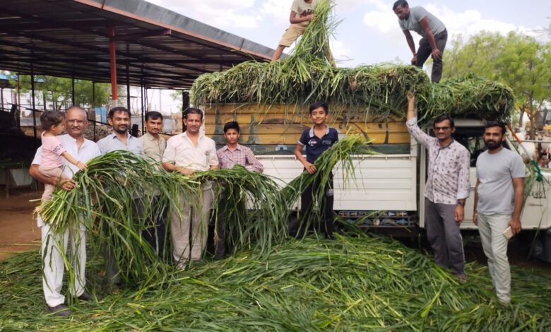 Rajasthan News निर्जला एकादशी तिथि के शुभ अवसर पर तीन गाड़ी हरा चारा गौ भक्तो ने गौशाला में भेंट किया