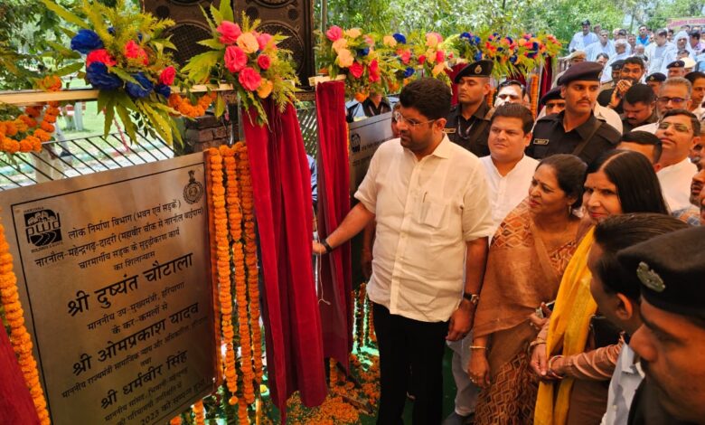 नारनौल 1 जून। हरियाणा के उप मुख्यमंत्री दुष्यंत चौटाला ने वीरवार को क्षेत्र को 12.20 करोड़ रुपए की विभिन्न परियोजनाओं की सौगात दी। उन्होंने प्रजापति समाज की और से नसीबपुर में आयोजित कार्यक्रम के दौरान विभिन्न सड़क मार्गों का सुदृढ़ीकरण कार्य का शिलान्यास किया। इस मौके पर उन्होंने अधूरी पड़ी प्रजापति धर्मशाला को एस्टीमेट बनवाकर पूरी करवाने की घोषणा की। सबसे पहले डिप्टी सीएम ने नसीबपुर स्थित स्थित शहीद स्मारक पर पहुंचकर राव तुला राम को श्रद्धांजलि अर्पित करने के बाद 203.45 लाख रुपए की लागत से महावीर चौक से पुरानी कचहरी तक के सड़क मार्ग के सुदृढ़ीकरण का शिलान्यास किया। इस मार्ग पर दोनों तरफ नाले का निर्माण भी किया जाएगा। इसके साथ ही लगभग 360.04 लाख रुपए की लागत से तैयार होने वाले महरमपुर से जाखनी तक के सड़क मार्ग के सुदृढ़ीकरण का भी शिलान्यास किया। इसमें भी 800 मीटर तक दोनों तरफ नाले बनाए जाएंगे। इसके अलावा सीहमा-दुबलाना-बाछौद रोड के सुदृढ़ीकरण का भी शिलान्यास किया। इस पर लगभग 224.24 रुपए खर्च होंगे।