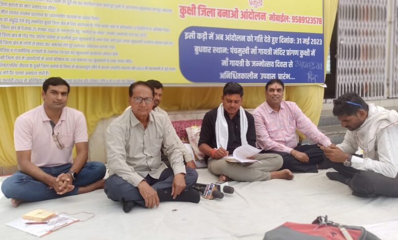 संभावित कुक्षी जिला क्षेत्र में व्यापारियों ने अपने प्रतिष्ठान बंद रख मुख्यमंत्री के नाम ज्ञापन सौपे। मुख्यमंत्री शिवराजसिंह चौहान द्वारा कुक्षी को जिला बनाने के विषय में भेदभावपूर्ण रवैया के कारण शारदीय नवरात्र (वर्ष -2022) की महानवमी से जूते चप्पल का त्याग कर नंगे पैर चलना अनवरत जारी है। दिनांक:27 फरवरी 2022 से अनिश्चितकालीन धरना प्रदर्शन प्रति रविवार रात्रि 8 से 10 बजे तक निरंतर जारी है। यह भी कि, इतनी गतिविधियों के बावजूद हमारी मांग पर शासन द्वारा उपेक्षा के कारण दिनांक: 31 मई 2023 बुधवार मॉं गायत्री जन्मोत्सव से जनसहयोग व जनसमर्थन से अनिश्चितकालीन उपवास पर सिर्फ जल का सेवन करते हुए मॉं गायत्री मंदिर प्रांगण कुक्षी में बैठा हूँ। जहां पर क्षेत्र के कई संगठन व जनसमुदाय समर्थन हेतु उपस्थित होने का क्रम जारी है। जिसका आज छठा दिवस हो चुका है। म.प्र. शासन आदिवासियों व पिछड़ा वर्ग के कल्याण के नाम पर विभिन्न माध्यमों से करोड़ो अरबो रुपया सरकारी खजाने से लगा रही है, परन्तु वास्तविक विकास ही करना है आदिवासियों व पिछड़ा वर्ग सहित हमारे आदिवासी बाहुल्य क्षेत्र कुक्षी का तो कुक्षी को जिला बनाकर अपने शासकीय कार्यो को धरातल पर लाये।