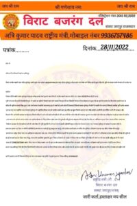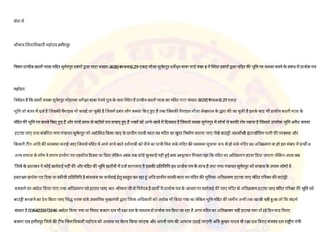 इसकी प्रतिलिपि इस प्रार्थना पत्र के साथ है तथा नगर पंचायत सुमेरपुर को समाज के तमाम लोगों ने हस्ताक्षर प्रार्थना पत्र दिया था स्कीवी प्रतिलिपि है संकलन पर कार्रवाई हेतु प्रस्तुत कर रहा हूं अति प्राचीन काली माता का मंदिर की भूमिका अतिक्रमण हटाया जाए मंदिर परिसर की बाउंड्री बनवाने का आदेश किया जाए तथा अतिक्रमण को हटाया जाए अतः श्रीमान जी से निवेदन है प्रार्थी के प्रार्थना पत्र के आधार पर कार्रवाई की जाए मंदिर से अतिक्रमण हटाया जाए मंदिर परिसर की भूमि को बाउंड्री बनवाने का देश किया जाए सिद्ध शरण पांडे उपसचिव मुख्यमंत्री द्वारा जिला अधिकारी को आदेश भी किया गया था लेकिन भूमि मंदिर की जमीन अभी तक खाली नहीं हुआ जो कि संदर्भ संख्या है 12168220172646 आदेश किया गया था विराट बजरंग दल गौ रक्षा दल के माध्यम से प्रार्थना पत्र दिया जा रहा है अगर मंदिर का अतिक्रमण नहीं हटाया गया तो 15 दिन बाद विराट बजरंग दल हमीरपुर जिले की टीम जिलाधिकारी महोदय को आवास पर घेराव किया जाएगा और अपनी मांग की आवाज उठाई जाएगी अत्रि कुमार यादव गौ रक्षा दल विराट बजरंग दल राष्ट्रीय मंत्री !