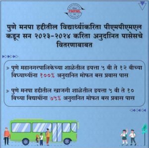 शैक्षणिक वर्ष 2023, 2024 के लिए, पुणे परिवहन निगम ने पुणे नगर निगम के स्कूलों में कक्षा V से XII के छात्रों के लिए रियायती सब्सिडी वाले पास वितरित करने की योजना शुरू की है। उक्त पास हेतु आवेदन दिनांक 12/06/2023 से सभी आगर एवं पास केन्द्रों पर वितरित किये जायेंगे यदि संबंधित विद्यालयों के प्रधान या प्रतिनिधि अपने छात्रों के आवेदन पत्र भर कर एक साथ निगम के किसी आगर में जमा करते हैं तो उन्हें शिक्षण संस्थान को एक संयुक्त पास दिया।