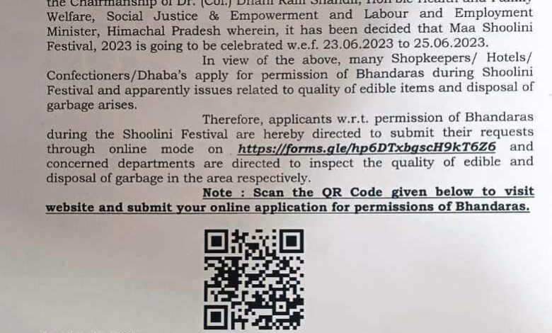Himachal Pradesh News माँ शूलिनी मेले में भण्डारों की अनुमति ऑनलाइन