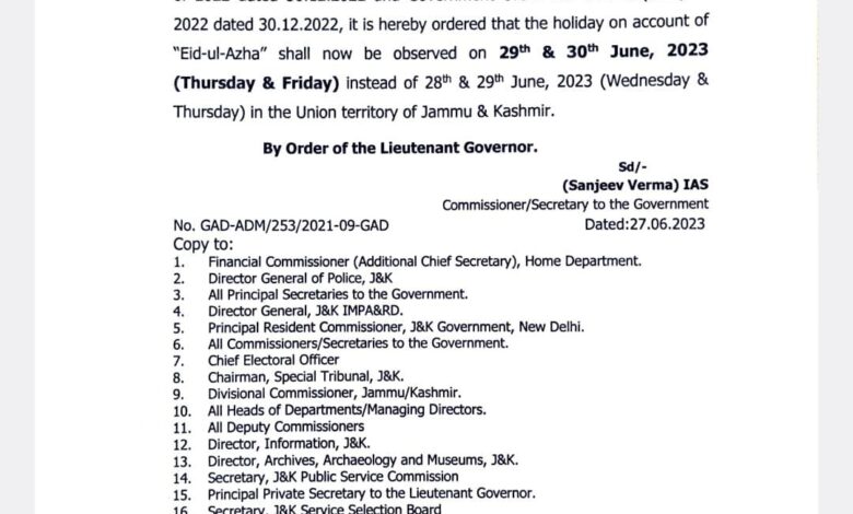 Jammu & Kashmir News 29-30 जून को ईद-उल-अधा की छुट्टियां: सरकार