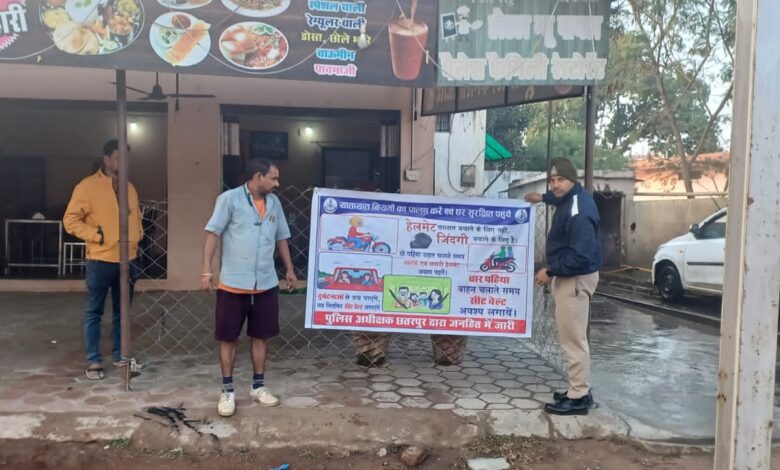 सड़क दुर्घटनाओं में कमी लाने एवं यातायात जागरूकता हेतु वरिष्ठ पुलिस अधिकारियों के निर्देशन एवं मार्गदर्शन में थाना प्रभारी यातायात निरीक्षक दलबीर सिंह मार्को एवं थाना यातायात पुलिस टीम द्वारा आज छतरपुर नगर की विभिन्न बैंक शाखाओं, होटल, ढाबो, रेस्टोरेंट, शराब की दुकानों, दो पहिया वाहन की विक्रय एजेंसियों में यातायात जागरूकता हेतु फ्लेक्स एवं बैनर लगाकर उपस्थित लोगों से यातायात संबंधी नियम बताए गए एवं सड़क दुर्घटनाओं से बचाव हेतु जागरूक किया गया।