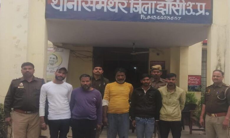झांसी समथर- श्रीमान् वरिष्ठ पुलिस अधीक्षक झाँसी श्री राजेश एस० महोदय के कुशल निर्देशन में पुलिस अधीक्षक ग्रामीण श्री श्री गोपीनाथ सोनी के निकट पर्वेक्षण व क्षेत्राधिकारी मोठ श्री हरिमोहन सिंह के निकट नेतृत्व में आज दिनांक 26.02.24 को थाना समथर पुलिस द्वारा मु० खानबहादुर कस्बा व थाना समथर जिला झाँसी के प्रथम पक्ष के 1. नहीम पुत्र सलीम खाँ उम्र करीब 30 वर्ष 2. बन्ट्री पुत्र हमीद खाँ उम्र करीब 40 वर्ष 3. शहजाद पुत्र हफीज खाँ उम्र करीब 26 वर्ष निवासीगण मु० खानबहादुर कस्बा व थाना समथर जिला झाँसी द्वितीय पक्ष के 1. रविन्द्र उर्फ दाऊ पुत्र लाखन सिंह उम्र करीब 25 वर्ष 2. लालजी उर्फ लाखन सिंह उम्र करीब 59 वर्ष निवासीगण मु० खानबहादुर कस्बा व थाना समथर जिला झाँसी द्वारा एक दूसरे के खिलाफ आपस में मुकदमा लिखाने को लेकर आपस में गाली गलौज कर झगडा फसाद पर आमदा होने पर शान्ति व्यवस्था भंग होने पर धारा 151/107/116 सीआरपीसी के तहत गिरफ्तार कर माननीय न्यायालय उपजिला मजिस्ट्रेट मोंठ जनपद झाँसी के समक्ष पेश किया गया अभियुक्त का नाम व पता- 1. नहीम पुत्र सलीम खाँ उम्र करीब 30 वर्ष 2. बन्दी पुत्र हमीद खाँ उम्र करीब 40 वर्ष 3. शहजाद पुत्र हफीज खाँ उम्र करीब 26 वर्ष 4. रविन्द्र उर्फ दाऊ पुत्र लाखन सिंह उम्र करीब 25 वर्ष 5. लालजी उर्फ लाखन सिंह पुत्र मोती सिंह उम्र करीब 59 वर्ष निवासीगण मु० खानबहादुर कस्बा व थाना समथर जिला झाँसी गिरफ्तार करने वाली पुलिस टीम- 1. उ0नि0 श्री वीरेन्द्र कुमार थाना समथर जिला झाँसी 2. उ०नि० रामदत्त पाठक थाना समथर झांसी 3. का० 950 अमरदीप थाना समथर जिला झांसी